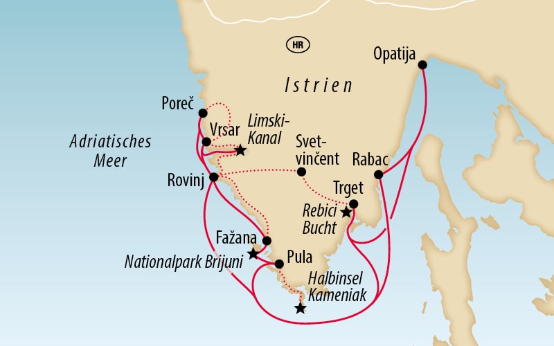 Türkisblaues Meer, duftende Macchia, romantische Altstädte – diese Reise verbindet Bewegung, Genuss und stilvolles Reisen auf eine besondere Weise. Tagsüber erkunden wir Istrien per e-Bike – durch Rebberge, Küstenwege und das grüne Hinterland. Abends geniessen wir die entspannte Atmosphäre an Bord unserer Yacht MS Amalia oder schlendern durch die Gassen alter Hafenstädtchen. Ein echtes Erlebnis für alle, die gerne aktiv sind – und das echte Kroatien lieben.