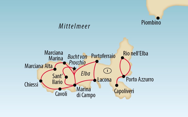 Die Insel Elba ist ein wahres Naturparadies und verzaubert mit wildromantischen Landschaften, verträumten Buchten und einer herrlichen Ursprünglichkeit, die Sie auf dem Festland nicht finden. Freuen Sie sich darauf, inmitten dieser Postkartenidylle mit dem e-Bike täglich unterwegs zu sein und am Abend unseren beliebten Ferienort Marina di Campo zu geniessen!